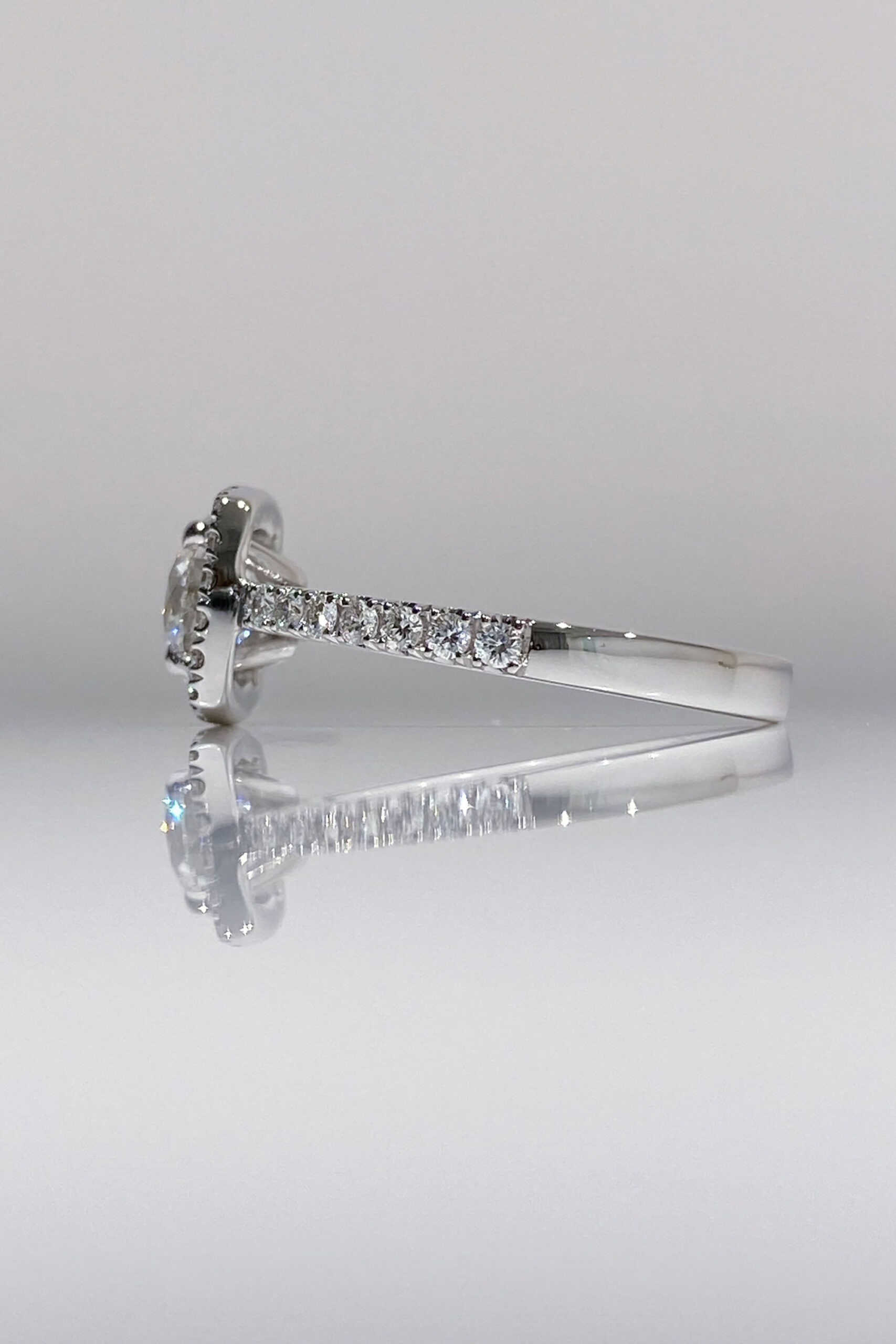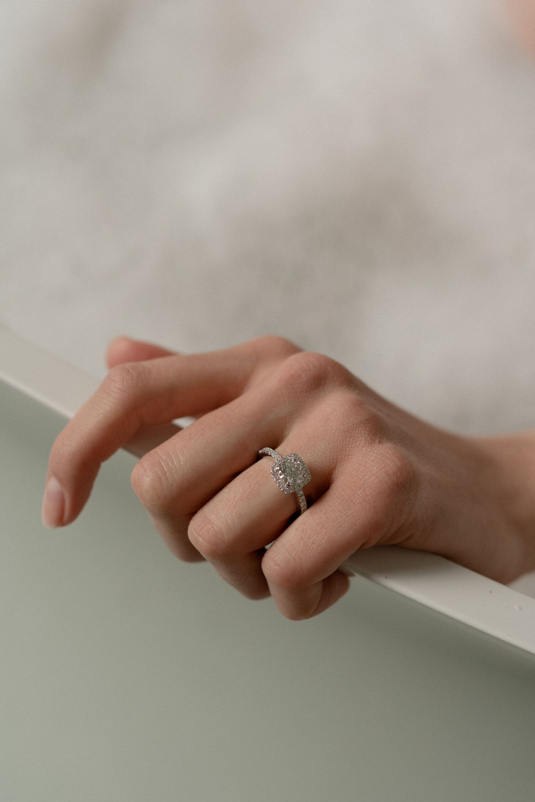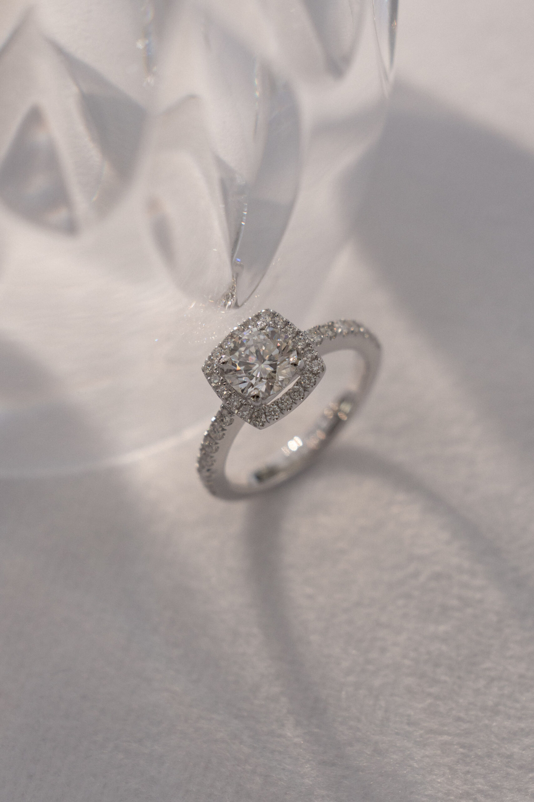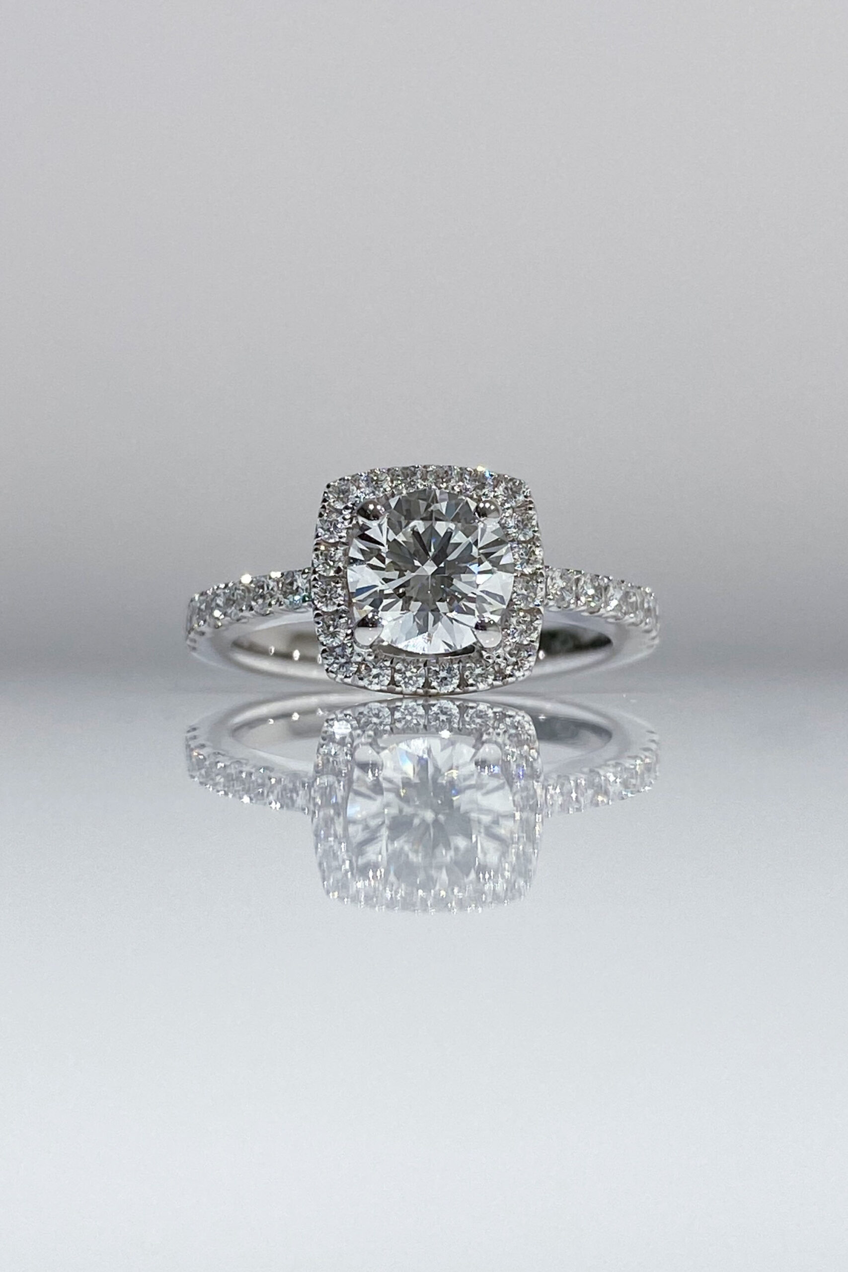 Bespoke solitaire Handcrafted in 18k white gold, set with brilliant-cut diamond of 1,02ct E VS1 and paved with brilliant-cut diamonds. This ring features square halo. Size 48 (resizeable).