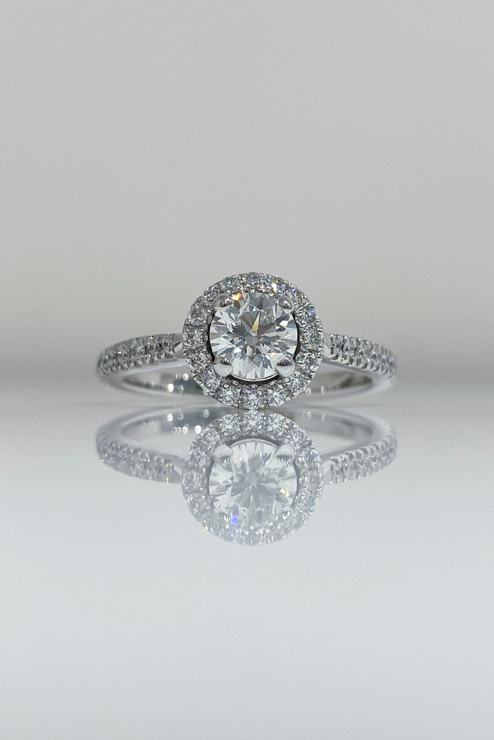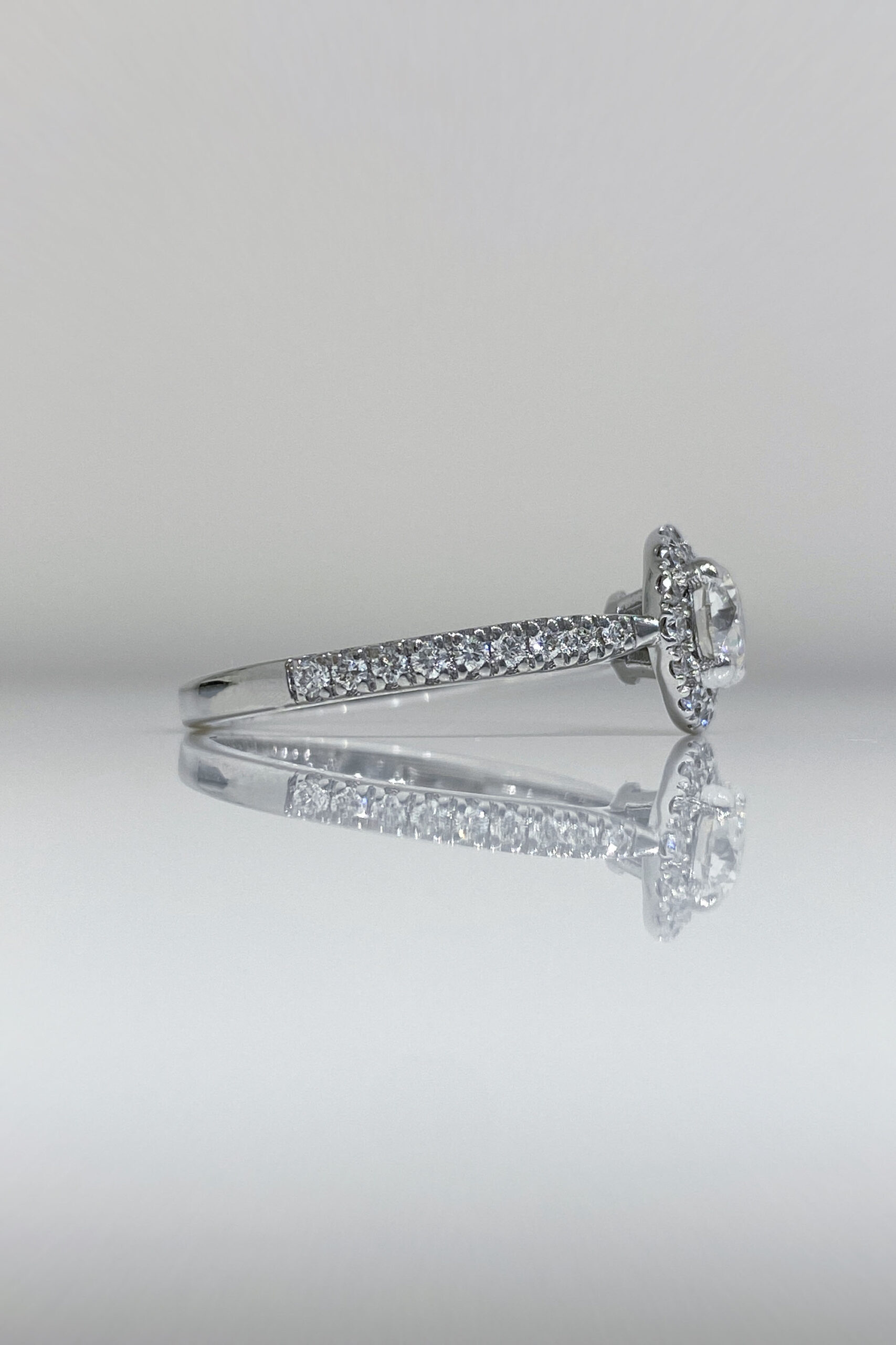 Solitaire Palais-Royal Handcrafted in 18k white gold, set with brilliant-cut diamond of 0,53ct G SI1 and paved with brilliant-cut diamonds.This ring has a halo of pavé diamonds. Size 53 (resizeable).