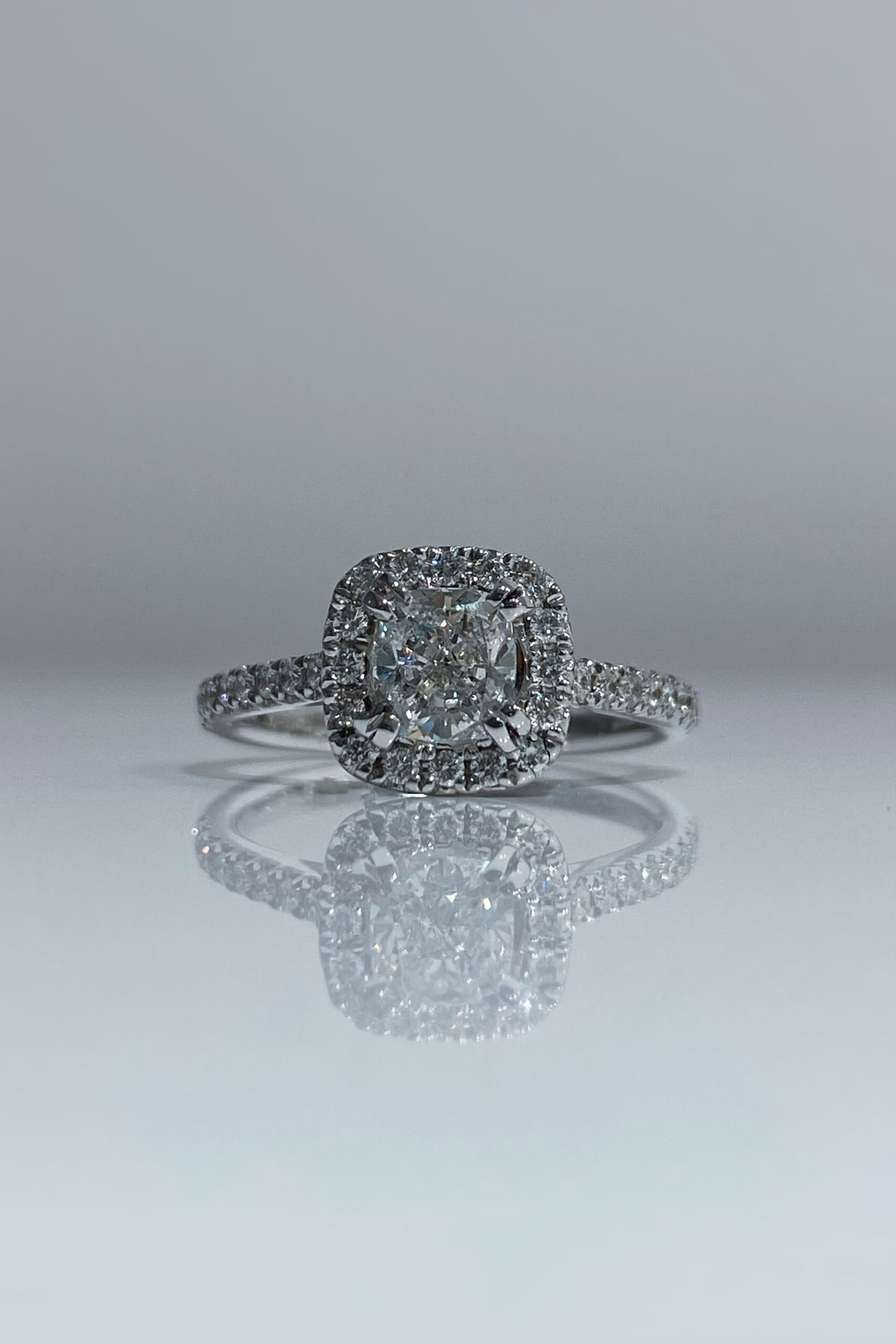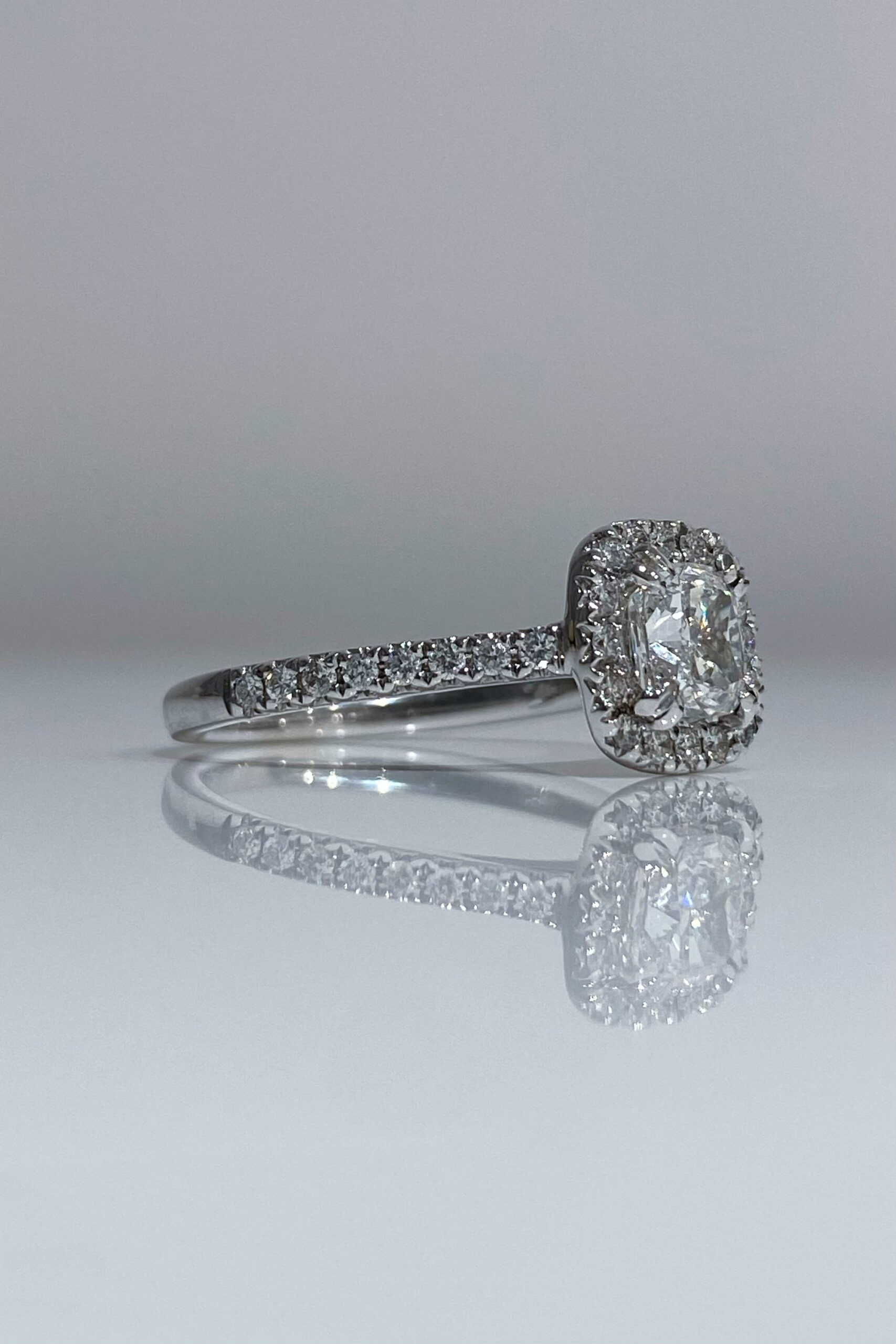 Solitaire Palais-Royal Handcrafted in 18k white gold, set with cushion-cut diamond of 0,72ct F VVS2 and paved with brilliant-cut diamonds. This ring has a halo of pavé diamonds. Size 51 (resizeable).